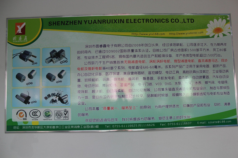 深圳市圓睿鑫電子有限公司自2008年創(chuàng)立以來,經(jīng)過誠信耕耘,在為期兩年的時(shí)間內(nèi),已通過ISO9001:2000國際質(zhì)量體系認(rèn)證。公司廠房占地面積2000多平方米,員工100人,專業(yè)技術(shù)工程師6名,擁有國內(nèi)最先進(jìn)的生產(chǎn)和檢測(cè)設(shè)備,年產(chǎn)各類減速電機(jī)超過2~300萬臺(tái)。因公司發(fā)展需要,于2020年底,將生產(chǎn)基地遷往擁有最美小鎮(zhèn)之稱的東莞市清溪鎮(zhèn),依山傍水,依托美麗的大自然環(huán)境和地方文化,全新的東莞市圓睿鑫電子有限公司將借助深圳母公司平臺(tái),一步步走上新的臺(tái)階。